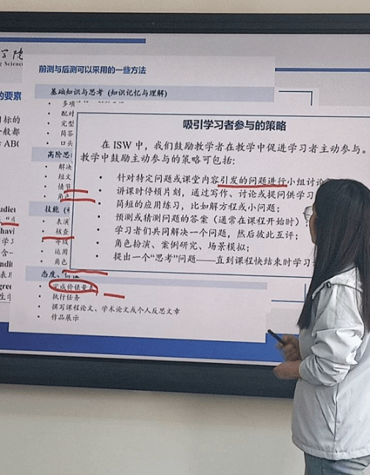 其次,介绍了本次培训的日程简表;分享了如何在导入中建立学习动机的策略,比如:讲述一个与主题相关的简短而又引人入胜的故事;从对象、行为、条件、程度这四个要素入手,分享了如何撰写学习目标;讲解了前测与后测可以采用的一些方法、吸引学习者参与的策略、40分钟迷你教学循环流程等。