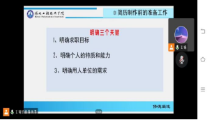 王琦老师首先从简历的主要作用和在求职过程中的重要性进行讲解,引起了同学们对制作一份优秀简历的重要性的高度重视。接着王老师从简历制作前的准备、简历的内容、简历的形式、简历制作的技巧与注意事项和简历的投递五个部分进行了详细的讲解。