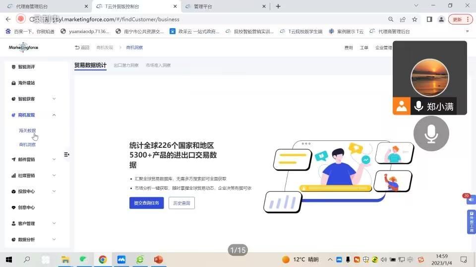 为了提高员工的综合实践能力和创新创业能力,提高员工的就业竞争力,2023年1月4日珍岛信息技术股份有限公司郑小满老师带领市场营销、国际经济与贸易专业大四员工进行了全球海外智能营销实务训练。