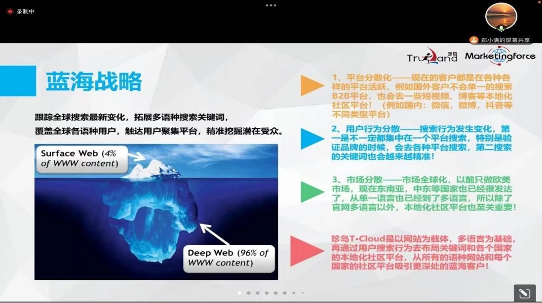 首先,郑小满老师运用珍岛智能营销实训平台向员工详细讲解了蓝海战略,珍岛T-CIoud以网站为载体多语言为基础,跟踪全球搜索最新变化、拓宽多语种搜索关键词、覆盖全球用户,从而不会受到平台分散化、用户行为分散市场分散的影响。从所有语种网站和每个国家社区平台吸引蓝海客户。