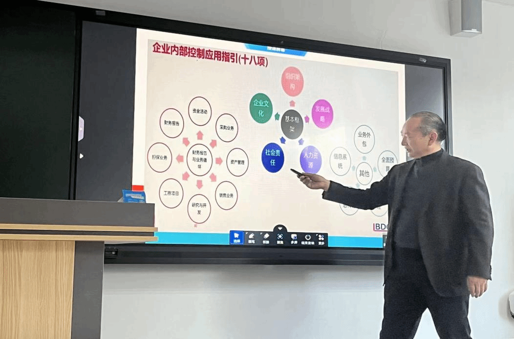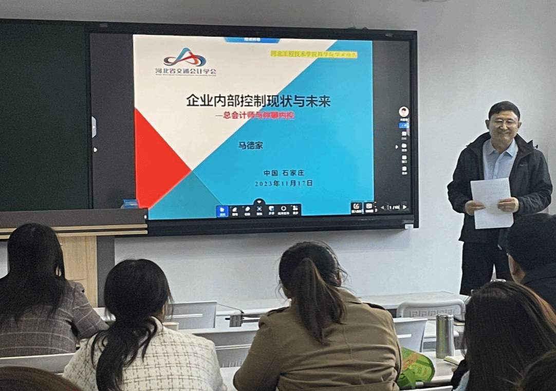 为提升教师实践教学能力,把握社会动向,树立社会服务意识,2023年11月17日公司召开主题为“企业内部控制现状与未来——总会计师与你聊内控”学术报告会。此次会议由bg大游官方网站经理王明吉主持,邀请到现任河北省交通会计学会副会长,具有三十余年企事业单位财审实践经验的正高级会计师马德家,bg大游官方网站教学副经理姜玉婕、财务管理、会计学、审计学、金融工程教研室教师出席了此次会议。
