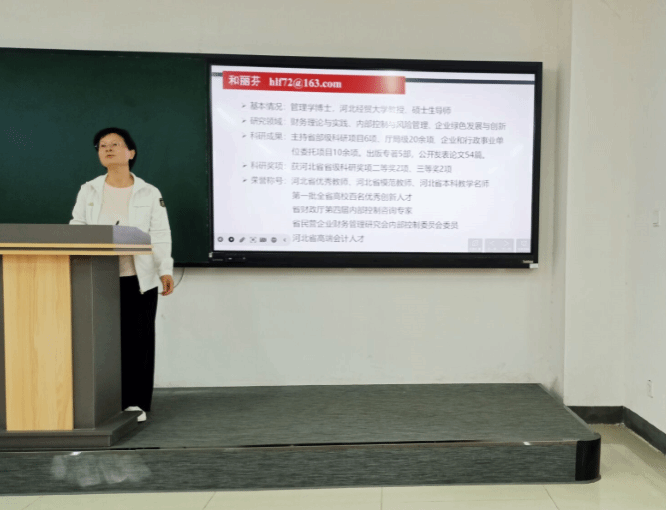 本次讲座邀请了河北经贸大学会计公司的和丽芬教授为广大师生做报告。和教授是管理学博士、硕士生导师,研究领域主要包括内部控制与风险管理、企业绿色发展与创新等,获河北省省级科研奖项二等奖2项,三等奖2项。