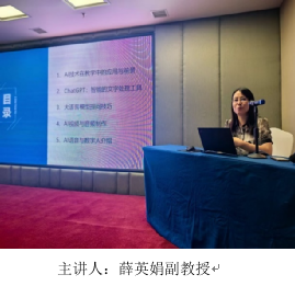 本次培训旨在通过前沿的理论讲解、生动的案例分析以及实操演练,帮助教师们深入理解AI技术的基本原理、应用场景及在教育领域的潜在价值。培训内容涵盖了AI技术在课程设计、个性化教学、智能评估、教学资源优化等方面的最新研究成果与实践经验。特邀中北大学薛英娟副教授担任讲师,为参训教师带来了丰富而精彩的知识盛宴。