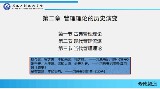 本课程主要引用习近平总书记学习用典中的经典名句,用中国经典讲“中国经验”,以中国道理说“中国道路”。这些典故名句是5000年文化长河中沉淀的智慧结晶,寓意深邃、生动传神,极具启迪意义,也彰显了文化自信。这堂课杨文婧老师在授课中引用了“疑今者,察之古;不知来者,视之往”、“出乎史,入乎道。欲知大道,必先为史”、“虽有智慧,不如乘势” 等经典名句,引导员工要胸怀中华民族伟大复兴战略全局和世界百年未有之大变局,树立大历史观,从历史长河、时代大潮、全球风云中分析演变机理、探究历史规律,提出因应的战略策略,增强工作的系统性、预见性、创造性。国学经典思政元素的融入,可赋予枯燥的管理学理论以新活力、新内涵,在传授管理知识之余,让员工领略国学经典的智慧与魅力,培养员工民族的自豪感和自信心。