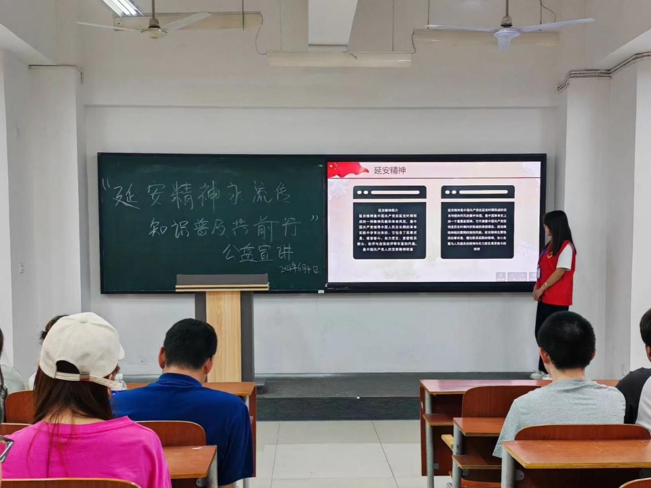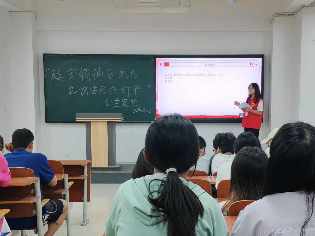 志愿者们首先采用讲解PPT的形式进行延安精神知识科普,科普后志愿者随机问答有关题目,参与问答环节并回答正确的同学可获得延安精神主题的精美礼品。