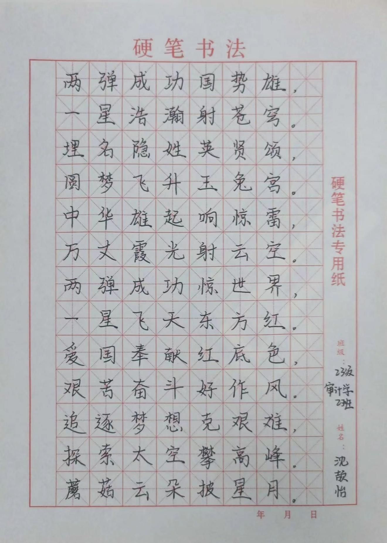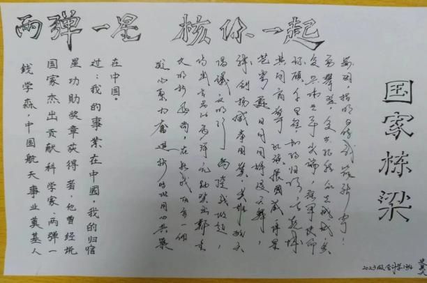 本次活动以一种书法方式进行两弹一星精神的展现,同学们更加深刻地领会到了先辈们的奉献与奋斗精神,激励着他们在今后的学习和生活中不断进取,为国家的繁荣发展贡献自己的力量。这些充满激情与敬意的书法作品也将成为一份珍贵的记忆,持续激励着更多的人关注国家科技事业,传承和弘扬伟大的民族精神。
