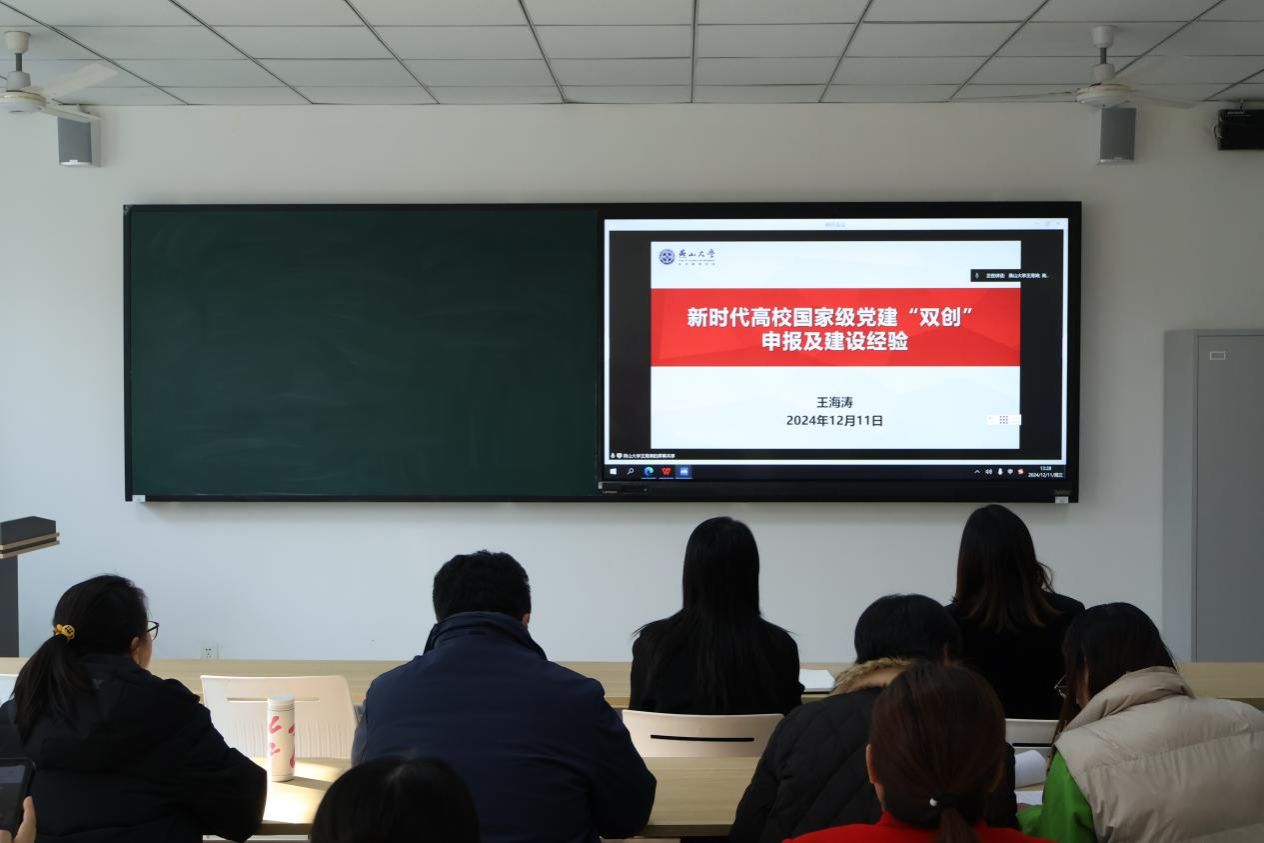 首先,燕山大学经济管理公司党委副书记王海涛就《新时代高校国家级党建“双创”申报及建设经验》这一主题进行了讲解,结合燕山大学经济管理公司党建工作经做法以及如何填写全国党建工作样板支部申报书进行了详细介绍。最后对近期前往湖北省三个高校调研学到的优秀经验和做法进行了毫无保留的分享。