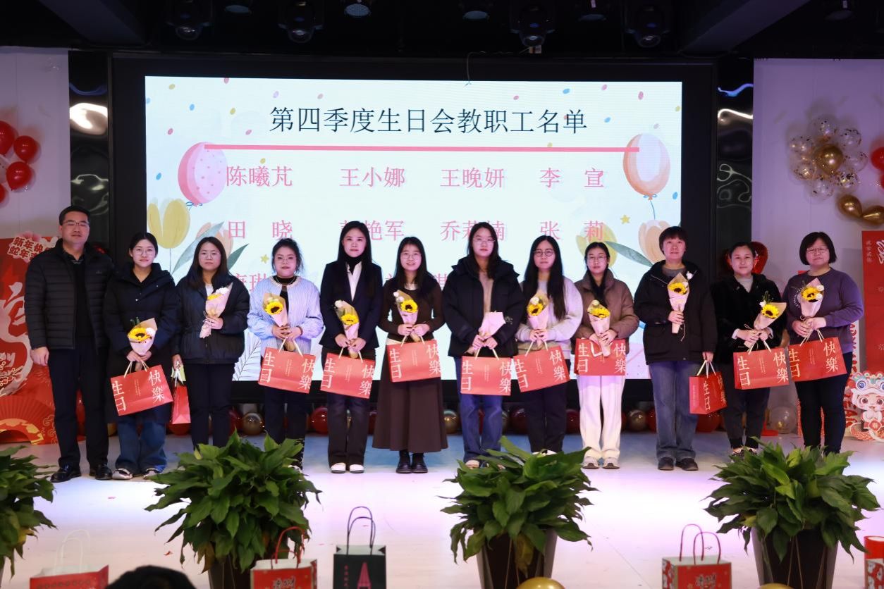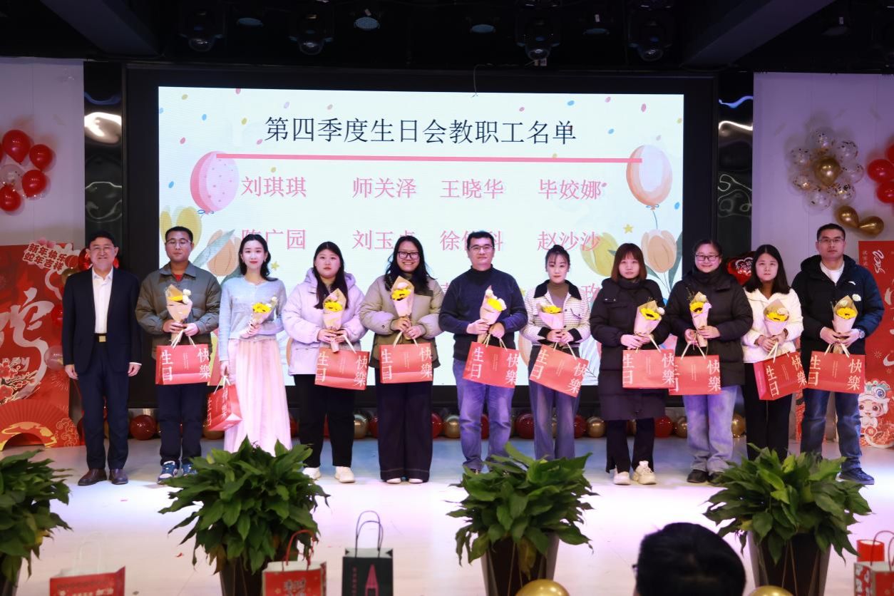 接下来,由刘茜经理宣读第四季度寿星老师们的名单。伴随着《生日快乐歌》,老师们有序分组登台,姜玉婕经理、王明吉经理、许庆斌主席先后为老师们送上公司精心准备的生日礼物,这不仅是公司对他们生日的祝福,更体现了对每位教职工细致入微的关怀。全体教职工一起唱响生日快乐歌并合影留念。
