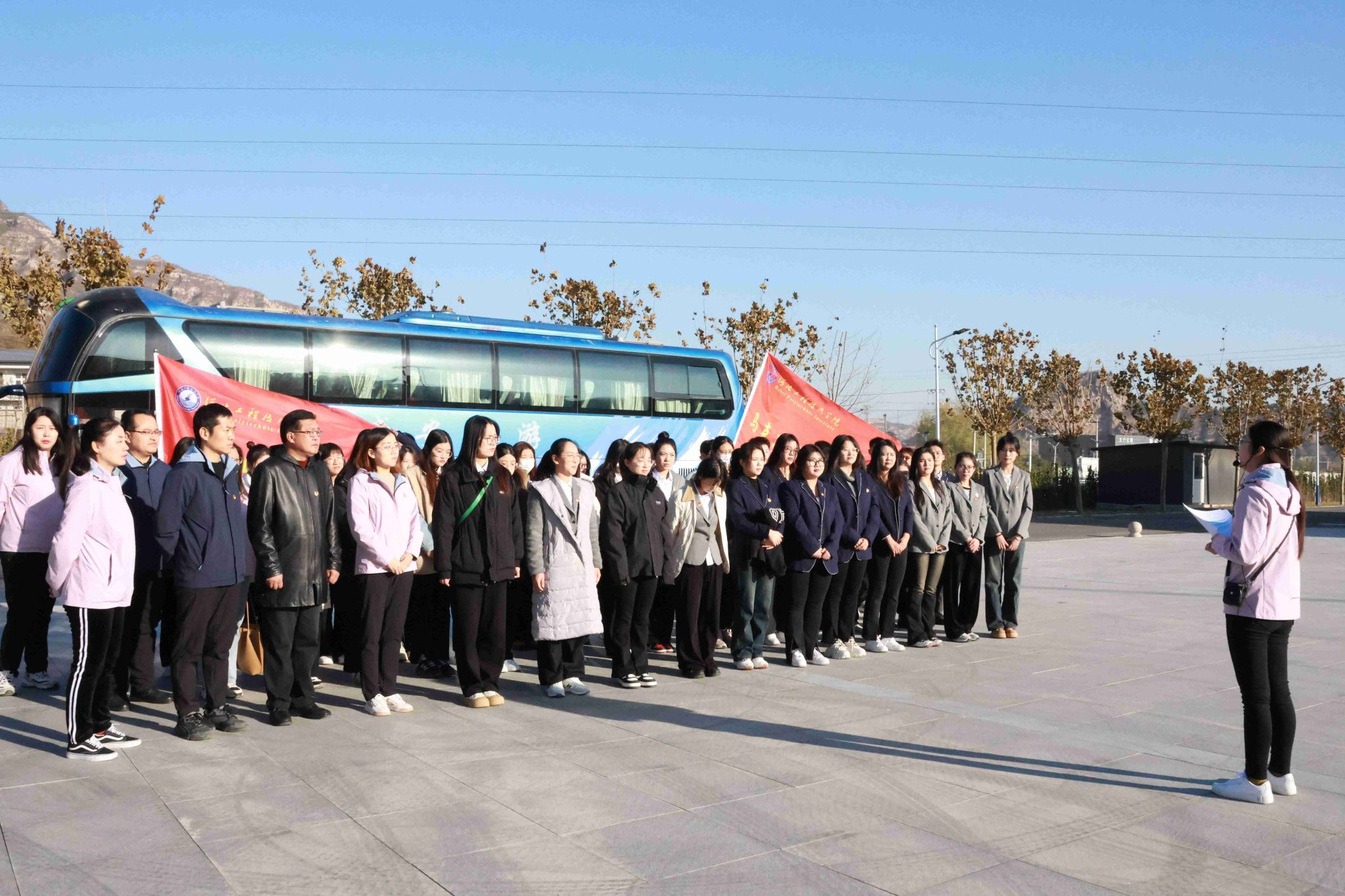 出发前,党总支书记刘茜向同学们介绍开展此次研学活动的目的和意义,并对相关安全和纪律问题进行重点强调。途中,在bg大游官方网站思政教研室主任陈赤华和辅导员樊风彩的带领下,师生同唱红色歌曲,追忆红色故事,感悟革命先辈的拼搏奋斗精神。