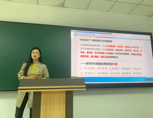 马秀丽老师结合外出学习的心得体会,做了题为《立德树人有道 春雨润物无声》的课程思政汇报。马老师首先重点分享了西安交通大学周屈兰教授以《燃烧学》为例的课程思政实践。其次,结合内容谈了国际经济与贸易专业主要课程思政实践:比如讲到中国由贸易大国向贸易强国转变, 以此出发,可以引导员工讨论青年员工要有怎样的历史使命感,要有怎样的责任担当;比如讲到国际市场营销,做市场分析时,告诉员工坚持“四个自信”的同时,也要尊重他国文化和贸易习惯;比如讲到寻找国外客户时,要有风险意识,要坚持国际利益高于一切,重视对客户的资信调查等。