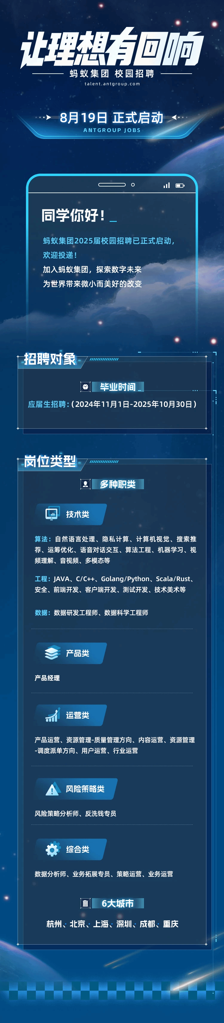 日期: 2024-08-21      发布:岳亚鑫      信息来源: 蚂蚁集团招聘(ID:ANT-Fin-Recruitment)      点击数: