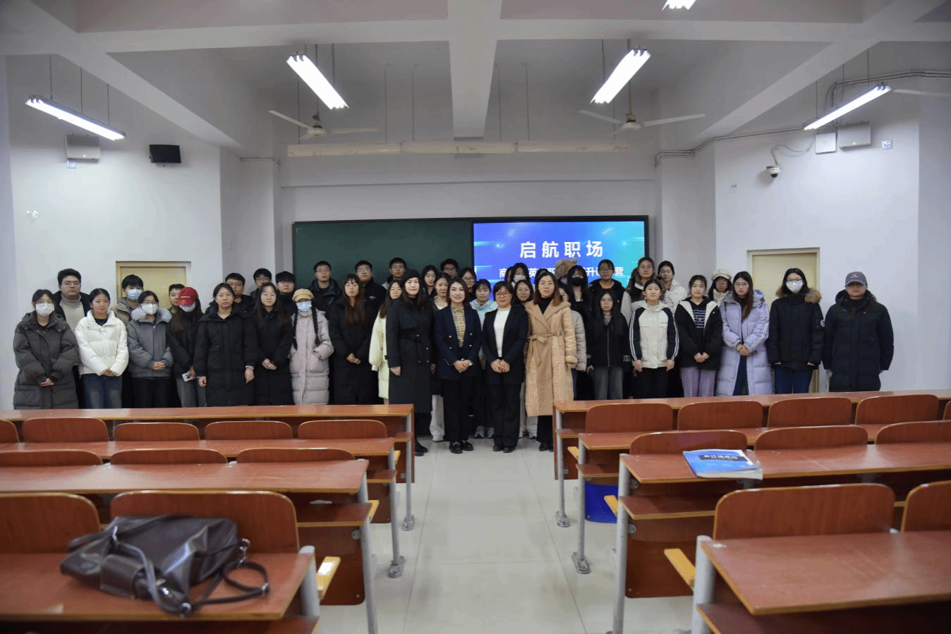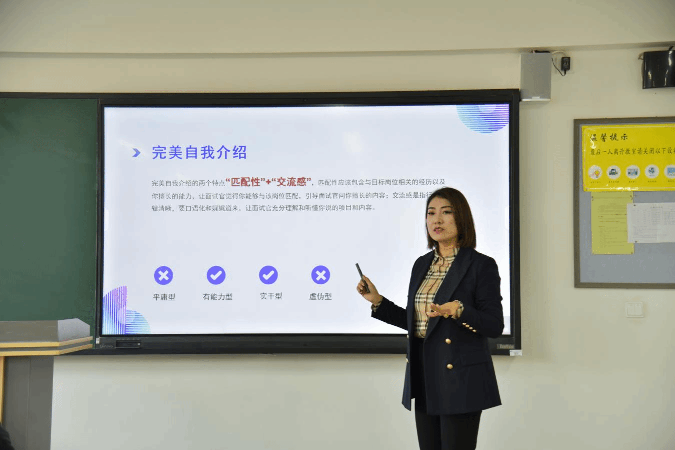 在307教室,张怡静讲师从着装、面试表现等多个核心方面切入,着重对不同行业面试着装的规范与禁忌进行了细致入微的讲解,并现场指导台上员工的站姿、坐姿以及表情管理,帮助同学们深入了解面试前需要做的各项准备,使他们在面试时能够充分展示自身优势,增强面试自信。在问答环节,同学们积极提出“面试时怎样巧妙回应自身缺点”等问题,张老师都给予了耐心且专业的解答。
