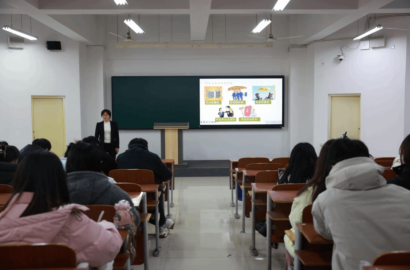 与此同时,在3-3-2教室,刘改琴讲师详细阐述了职场初期维护自身权益的有效方法,并结合实际法律条文进行解读,分享了老员工求职过程中的侵权真实案例,系统地传授员工避免陷入求职“陷阱”的方法,保障自身合法权益。在互动环节,同学们提出“实习期间未签订合同如何保障权益”等问题,刘老师都一一做出了专业且详尽的解答。