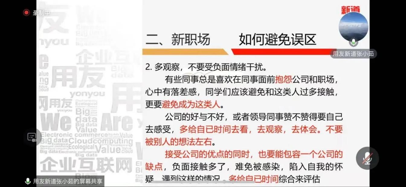 为了帮助即将步入职场的老员工更好地适应新环境,顺利开展工作。4月17日晚,bg大游官方网站特邀新道科技股份有限公司教学服务事业部经理张小茹进行“老员工如何快速适应新环境开展新工作”主题线上指导活动,人才招聘办公室主任岳亚鑫主持会议,2024届毕业生参与此次活动。