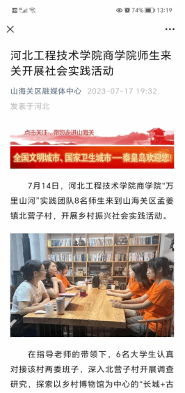 此次实践活动得到北营子村村书记及其他村干部的大力支持和感谢,特为暑期社会实践万里山河队写了一封感谢信,并且还被翼云客户端、山海关区融媒体相继报道。