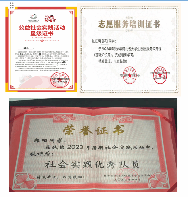 郭阳作为一名共青团员,他一直努力学习马克思列宁主义,毛泽东思想,自觉遵守团的纪律和国家法律,发扬共产主义道德风尚,维护国家和人民的利益,热情支持好人好事,积极缴纳团费并参与团委组织的各项活动。在活动中学习和思考,不断提高自己各方面的能力和个人政治素养。于2023年11月荣获2023暑期社会实践活动中,获得社会实践优秀队员。