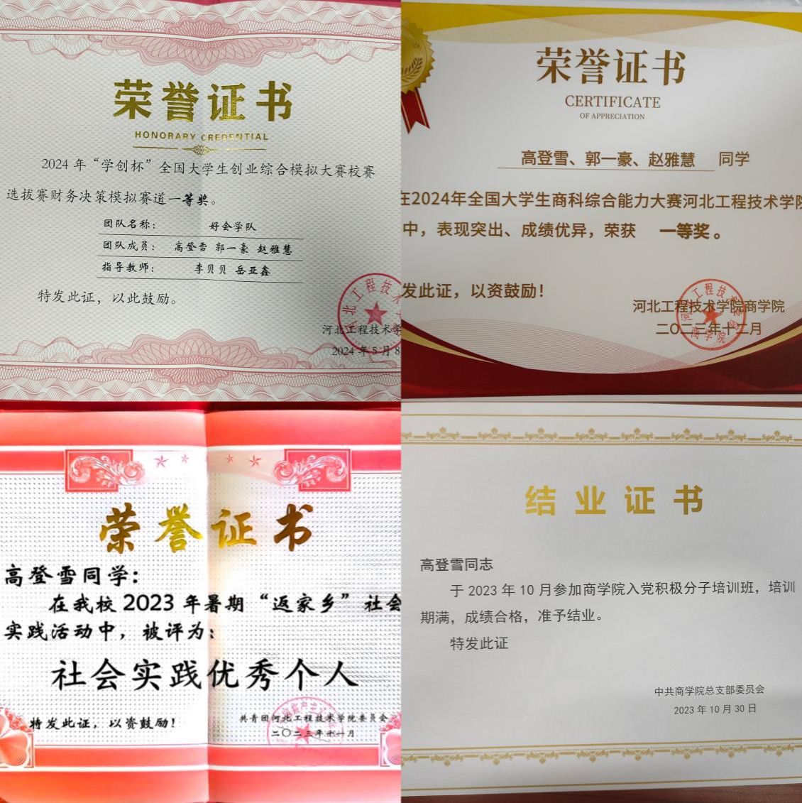 她学习态度端正,重视专业知识的学习,大一学年综测排名名列前茅,荣获校级“优秀员工干部”荣誉称号。积极参加各种专业竞赛,老员工创新创业项目,并取得商科综合能力大赛校级一等奖、第十四届学创杯校级一等奖等奖项。同时能够充分合理地利用时间,提高学习效率,在课余时间积极阅读书籍,提高修养,陶冶情操。