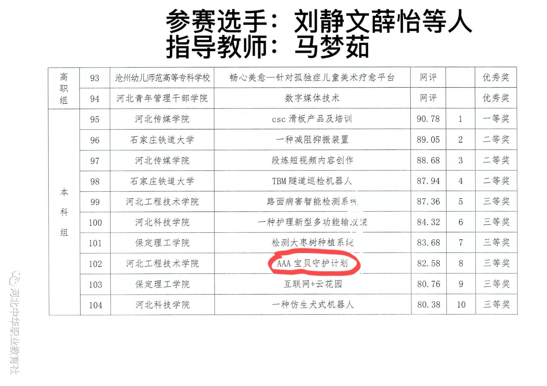 第三届河北省中华职业教育创新创业大赛,bg大游官方网站作品《AAA宝贝守护计划》荣获三等奖。参赛员工:刘静文 杨雅茜  薛怡  薛玟  丁虹羽  宁聪颖  王昊冉   指导老师:马梦茹