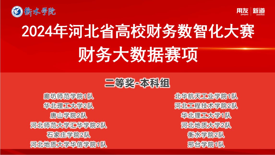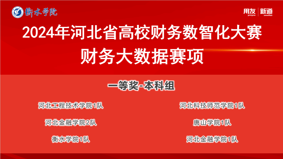 由河北省教育厅主办的2024年第五届河北省高校财务数智化大赛“财务大数据赛项”于2024年10月18日圆满落幕。bg大游官方网站由边圆围、刘莹和闫宇佳老师带领的2支队伍,一队刘晓君、吴晶羽、胡逍洋、赵任航和二队刘子扬、徐梦瑶、高炎琪、王静,在公司领导的大力支持和帮助下,在老师们的共同指导下,参赛同学努力练习不断努力进取下,分别获得河北省一等奖和二等奖的好成绩!