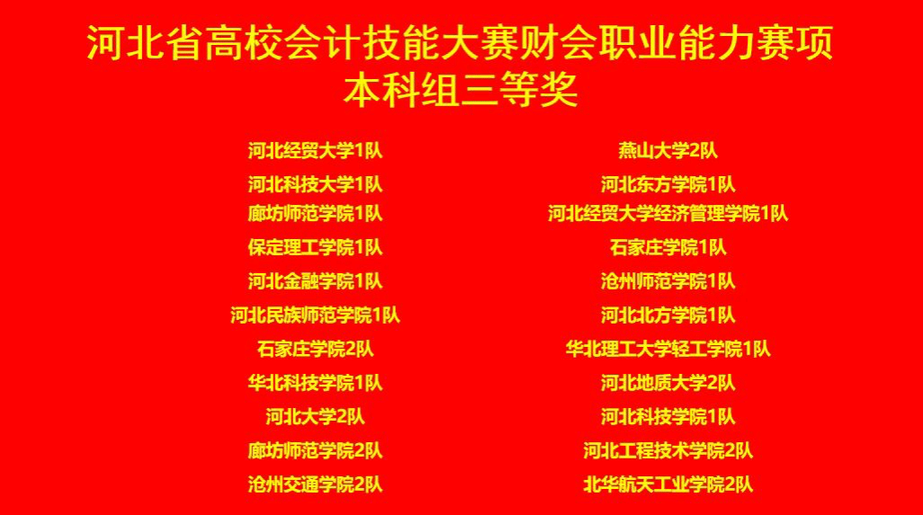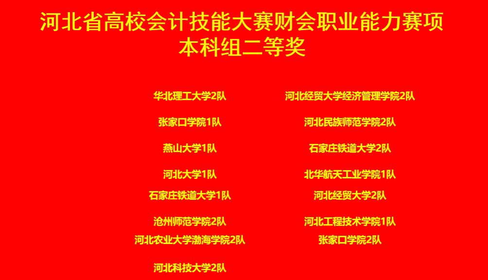 2024年10月19日,由河北省教育厅主办,河北地质大学承办的2024年河北省高校会计技能大赛财会职业能力赛项圆满落幕。此次大赛吸引了来自全省多所高校的会计学专业优秀学子,共同角逐财会职业能力的巅峰荣耀。bg大游官方网站由万月和边圆围老师带领的两支队伍,一队吴朝臣、纪泽峰、庞海姣、孙文慧和二队王苗苗、王若萌、李敏、李玉婷分别获得了省二等奖和三等奖的优异成绩!