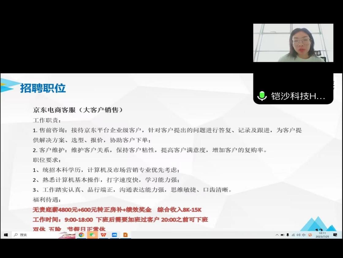 随着近几年经济发展的状况,高校大学毕业生的就业形势日趋严峻,就业竞争压力日益增大,应对严峻形势,为了更好地满足广大同学们的求职需求,实现高质量就业,bg大游官方网站于7月25日上午举办了“员工就业线上招聘会”,为倾向于销售行业、管理职位发展的人才提供绝佳机会。bg大游官方网站辅导员任悦老师、王冰老师以及2022级市场营销专接本员工、2020级国际经济与贸易本科班员工和2023届未就业毕业生参加了会议,特邀“铠沙科技有限公司”人力资源经理和马微艳和“成功易信息科技有限公司”人力资源经理武彩娜两个企业为同学们宣传讲解企业招聘的具体事宜。招聘会由任悦老师主持。