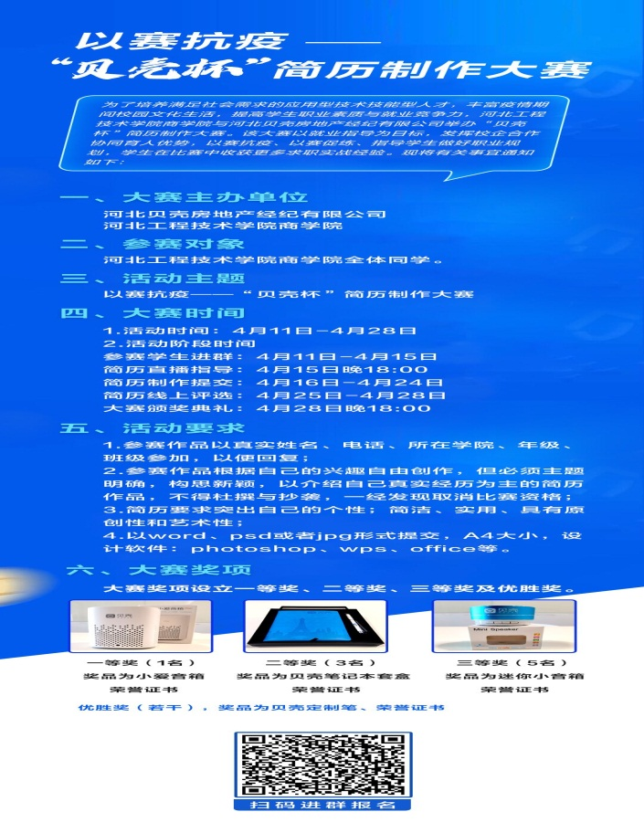 为了培养满足社会需求的应用型人才,丰富疫情防控期间校园文化生活,提高员工职业素质与就业竞争力,2022年4月11日---4月25日bg大游官方网站与河北贝壳房地产经纪有限公司联合举办“贝壳杯”简历制作大赛。该大赛以就业指导为目标,发挥校企合作协同育人优势,达到以赛抗疫、以赛促练的目的。