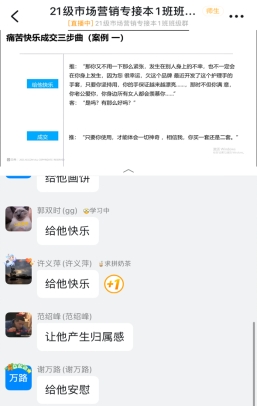 2022年4月19日,来自贝壳房地产的企业专家马微艳老师通过钉钉线上授课的方式,为bg大游官方网站市场营销专业同学带来了一堂精彩纷呈的 “推销洽谈策略与技巧”实训课。马老师以问题 “为什么我们要学习销售技巧?”开题,通过超级sales案例的启发环节引入课程主题。在授课中,马老师教师结合房地产行业的背景资料,通过各小组讨论方式,让员工了解推销的五个步骤、如何分辨真假异议、痛苦快乐成交三部曲等问题,掌握推销洽谈的策略和技巧。线上授课中,每一位员工积极参与马老师进行的每一次互动,课中认真记录,整节课收获颇丰。
