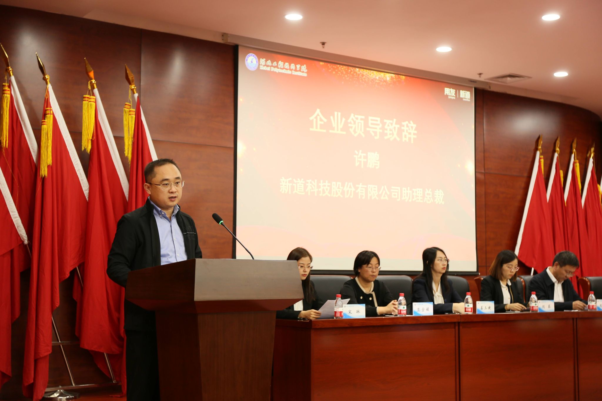 新道科技股份有限公司助理总裁许鹏发表致辞,许总表示新道公司作为中国领先的数智化人才培养服务商,要为高等教育和职业教育提供智能财务、数字人力、数字营销等综合教育产品与云服务解决方案,凭借先进的实践育人理念,依托用友集团超700万企业客户最新应用实践,通过数字化教育云平台,为院校构建校企合作、产教融合新范式,共建未来技术公司和现代产业公司,共同培养数智化人才,服务产业升级。