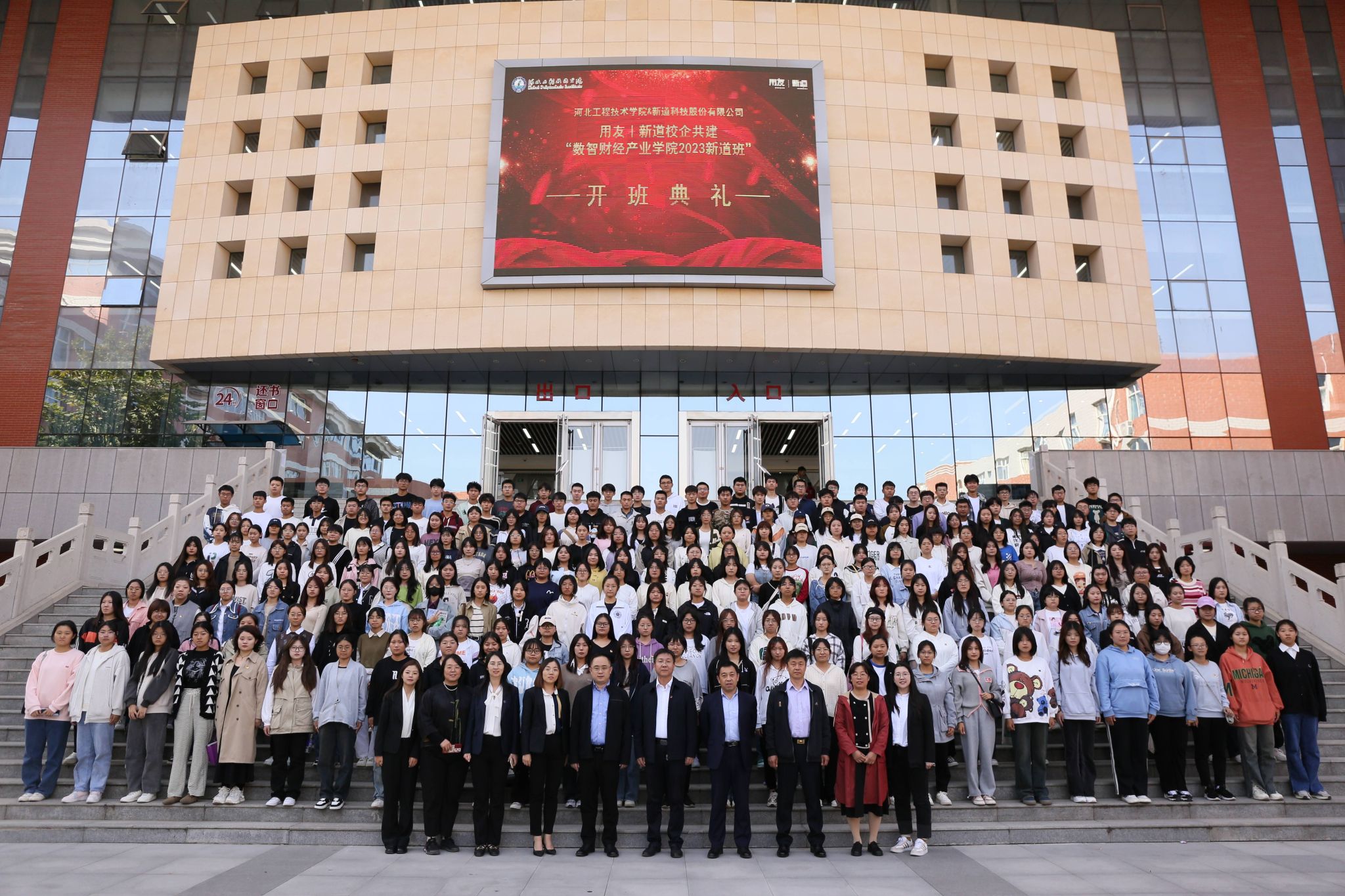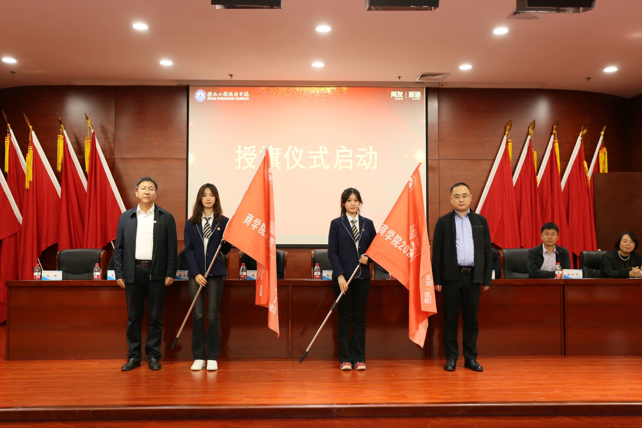 典礼上,bg大游董事长助理刘喜贵、新道科技股份有限公司助理总裁许鹏共同为数智财经产业公司2023级新道班进行授旗;bg大游官方网站李颖同学代表数智财经产业公司2023级新生发表讲话。
